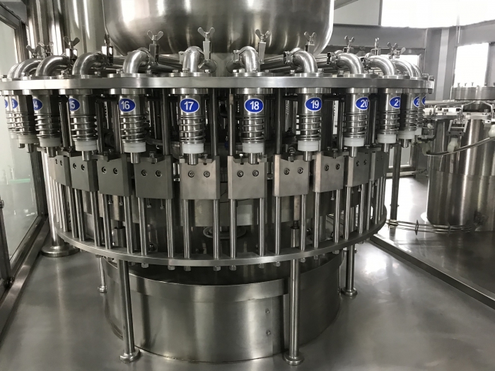 灌裝機(jī)械集清洗、灌裝、封口于一體,適用于各種果汁飲料、茶飲料的熱灌裝機(jī)械生產(chǎn)。灌裝機(jī)該設(shè)備采用的是性能可靠,操作簡(jiǎn)便,維護(hù)簡(jiǎn)單的微電腦控制系統(tǒng)和氣動(dòng)控制系統(tǒng),是將洗瓶、灌裝和壓蓋全過程在封閉狀態(tài)下進(jìn)行有效地防止純凈水或礦泉水在灌裝過程中可能發(fā)生的二次污染,做到真正的無(wú)菌灌裝,是目前國(guó)內(nèi)為理想的純凈水/礦泉水灌裝設(shè)備。同時(shí),通過更換少量零件,可用于純水和礦泉水的灌裝機(jī)械。灌裝機(jī)該設(shè)備采用的是性能可靠,操作簡(jiǎn)便,維護(hù)簡(jiǎn)單的微電腦控制系統(tǒng)和氣動(dòng)控制系統(tǒng),是將洗瓶、灌裝和壓蓋全過程在封閉狀態(tài)下進(jìn)行有效地防止純凈水或礦泉水在灌裝過程中可能發(fā)生的二次污染,做到真正的無(wú)菌灌裝,是目前國(guó)內(nèi)為理想的純凈水/礦泉水灌裝設(shè)備。灌裝機(jī)采用微型負(fù)壓重力灌裝機(jī)的先進(jìn)原理,快速、穩(wěn)定、準(zhǔn)確。灌裝機(jī)該設(shè)備采用的是性能可靠,操作簡(jiǎn)便,維護(hù)簡(jiǎn)單的微電腦控制系統(tǒng)和氣動(dòng)控制系統(tǒng),是將洗瓶、灌裝和壓蓋全過程在封閉狀態(tài)下進(jìn)行有效地防止純凈水或礦泉水在灌裝過程中可能發(fā)生的二次污染,做到真正的無(wú)菌灌裝,是目前國(guó)內(nèi)為理想的純凈水/礦泉水灌裝設(shè)備。配有完善的物料回流系統(tǒng),回流時(shí)還能實(shí)現(xiàn)獨(dú)立的氣體回流,不與物料接觸,減少物料的二次污染和氧化。灌裝機(jī)械能可滿足95℃以下熱灌裝的技術(shù)要求,灌裝機(jī)械閥和進(jìn)出料管道無(wú)衛(wèi)生死角,同時(shí)提供CIP自清洗接口。密封前提供RO水沖洗裝置,確保瓶口不發(fā)霉。采用磁扭矩式壓蓋頭,實(shí)現(xiàn)壓蓋和加蓋功能。螺帽扭矩?zé)o級(jí)可調(diào),具有恒扭矩旋封塑料帽的功能。